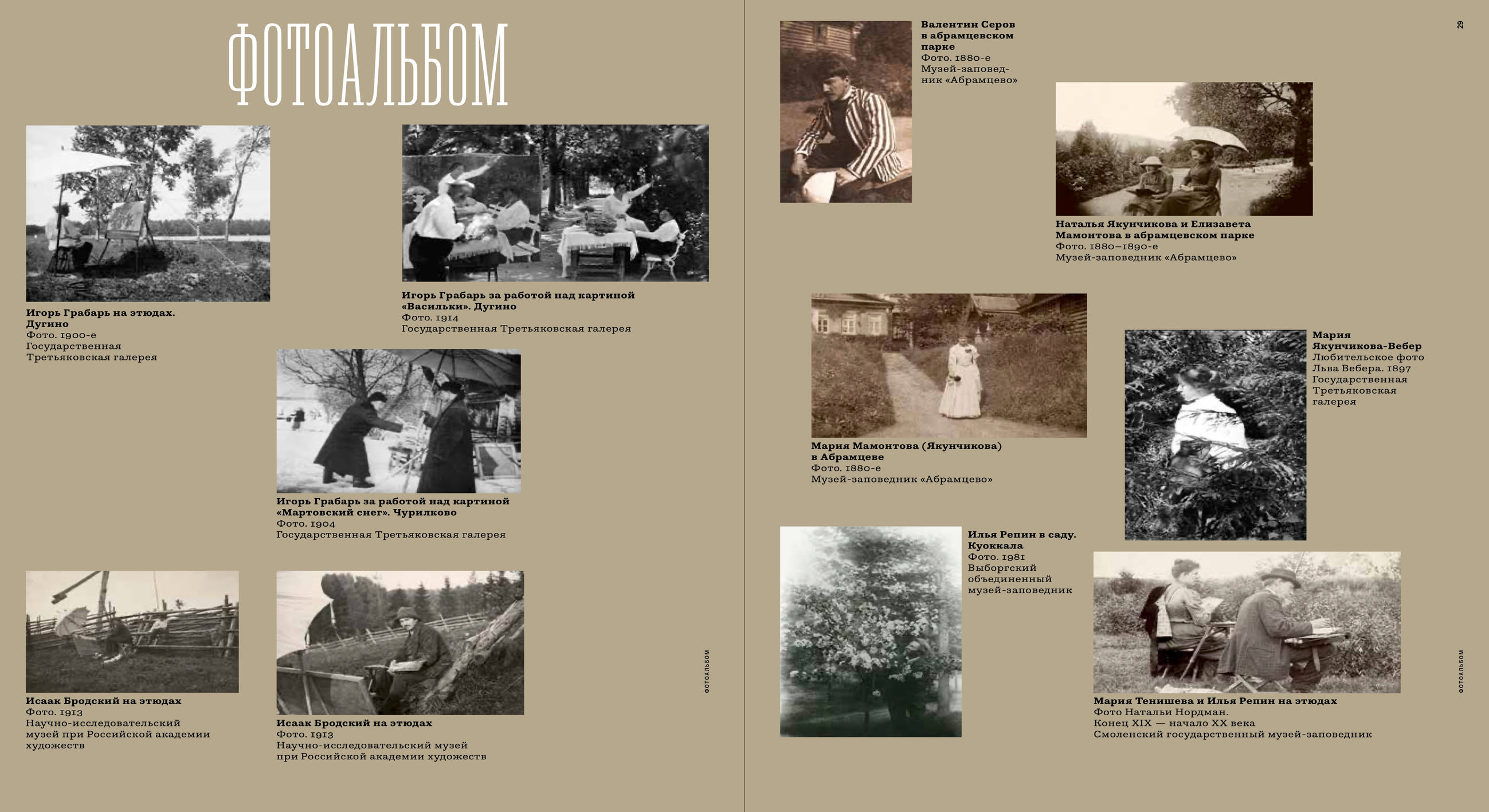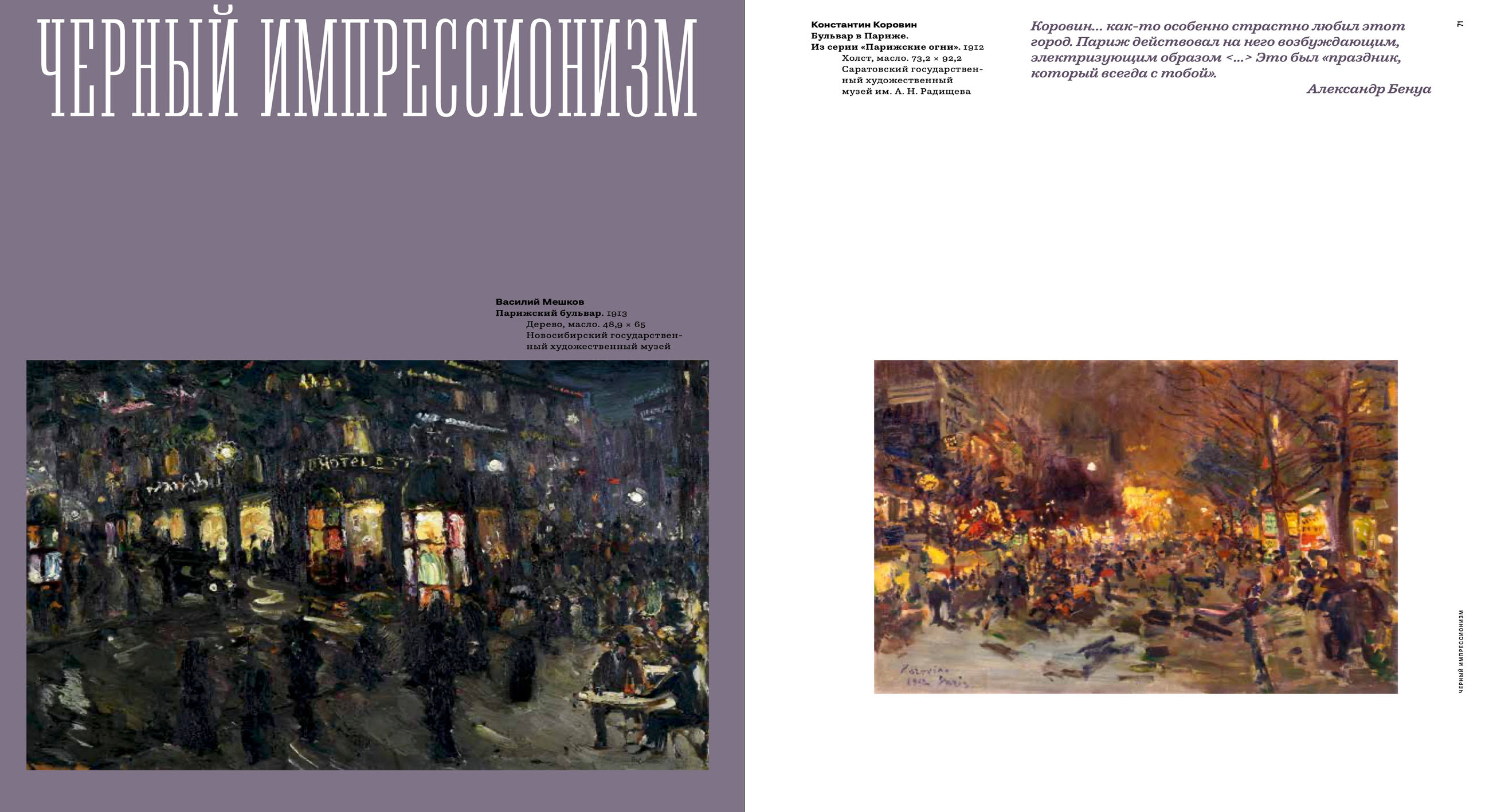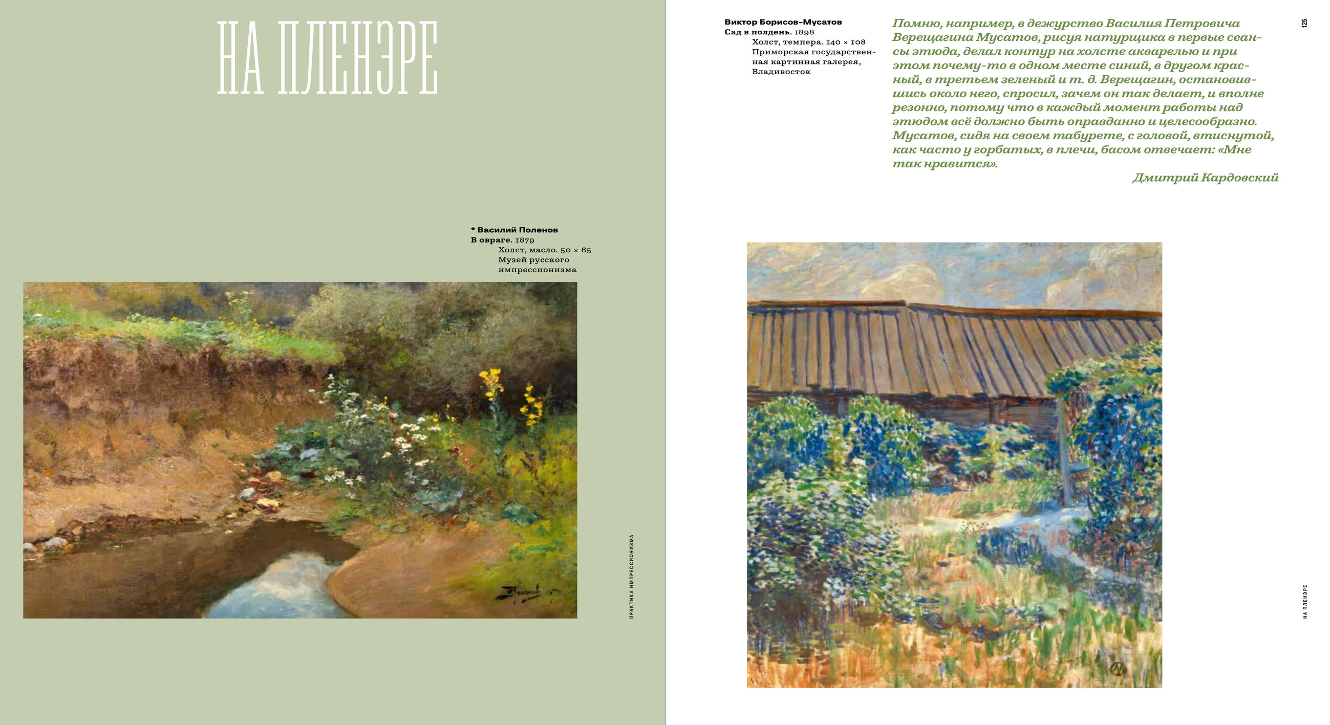 В самостоятельный раздел альбома выделены пленэрные работы и этюды, именно импрессионистами впервые приравненные к самостоятельному произведению. Практике импрессионизма посвящен и блок «Мастерская», где читатель попадает в классы Валентина Серова и студию Ильи Машкова. На рубеже XIX–XX веков популярными становятся и импрессионистические сюжеты: пикники, чаепития, катания на лодке, посещения кафе и театров. В портретном жанре и жанре городского пейзажа получает распространение «русский мотив»: это портреты молодых крестьянок Абрама Архипова и старые города Константина Горбатова и Петра Петровичева.