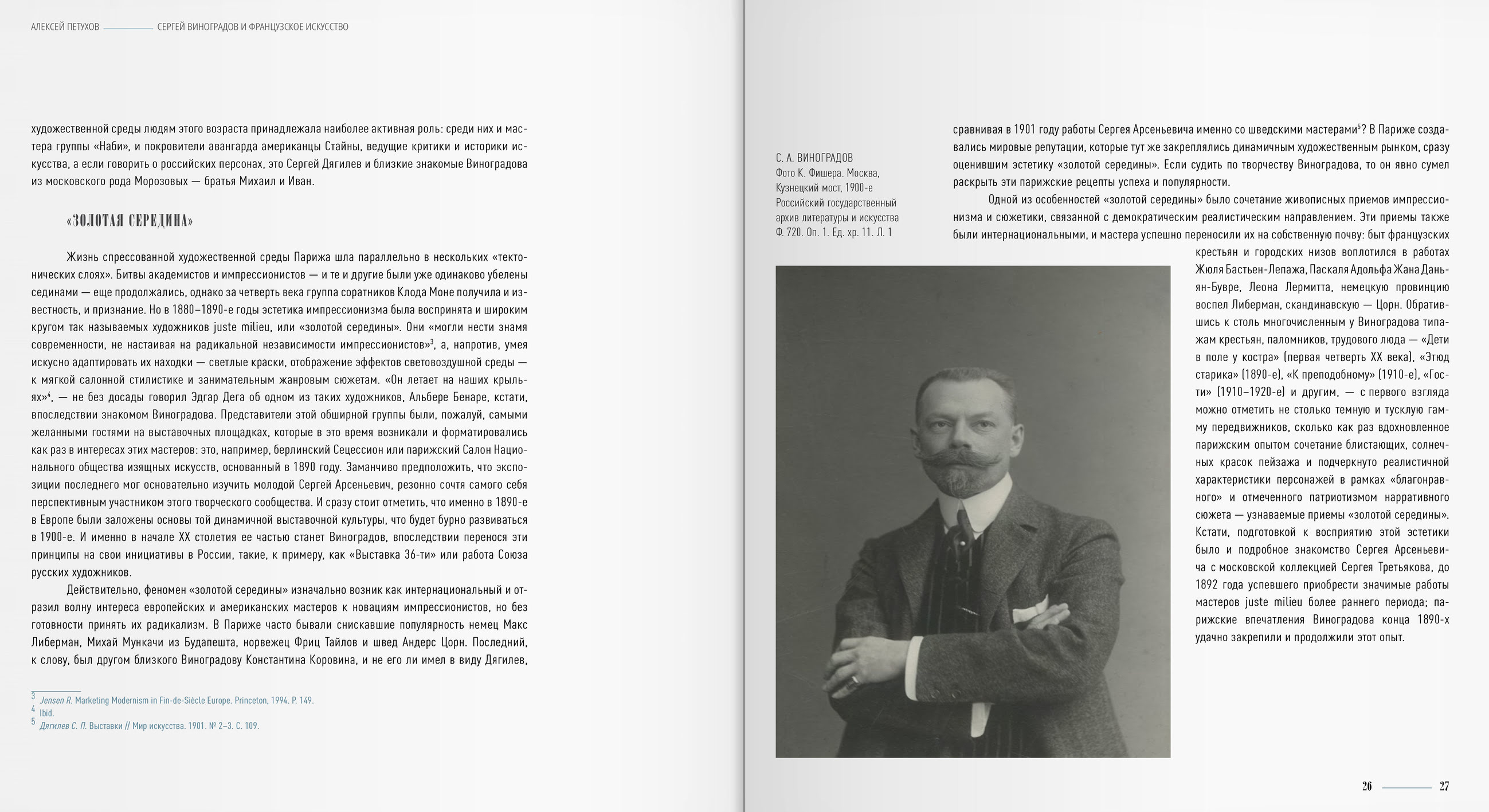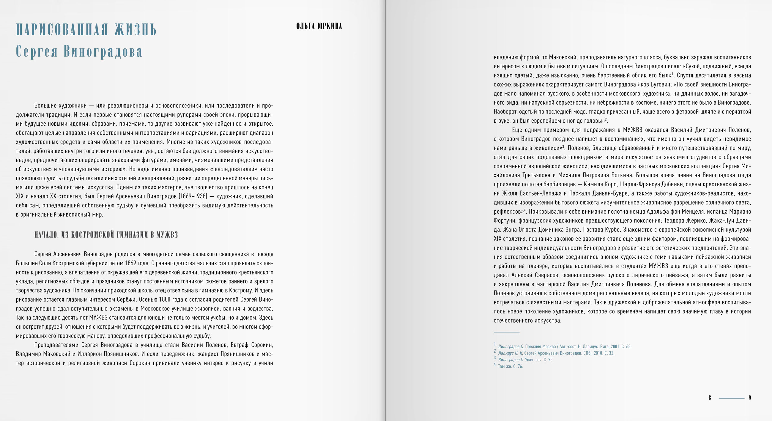 Сергей Арсеньевич Виноградов (1869–1938) — академик живописи, педагог, организатор художественных объединений и арт-консультант — одна из ключевых фигур русского искусства рубежа XIX—ХХ веков. Уроженец Костромской губернии, выпускник Московского училища живописи, ваяния и зодчества, Виноградов становится заметной фигурой в российской художественной среде, участвует в выставках Товарищества передвижников и «Мира искусства», входит в число организаторов объединений «36-ти» и «Союза русских художников». Часто бывая в Париже, Виноградов интересуется Новейшей французской живописью и консультирует братьев Морозовых при покупке работ Сезанна, Ренуара, Моне, Дега. «Нарисованная жизнь» Сергея Виноградова, писавшего усадебные пейзажи и интерьеры, морские виды и портреты, воссоздает мир гармонии и счастья, отчасти выдуманный и желанный, отчасти действительный даже в сложное время войн и революций. Художник, эмигрировавший из России в 1920-е, преподавал и писал в Риге, а его работы разошлись по музейным и частным собраниям всего мира. Эта книга-каталог со статьями Ольги Юркиной, Алексея Петухова и Александра Киселёва представляет широкому читателю наследие Сергея Виноградова, русского художника-импрессиониста, в его цельности и разнообразии.
