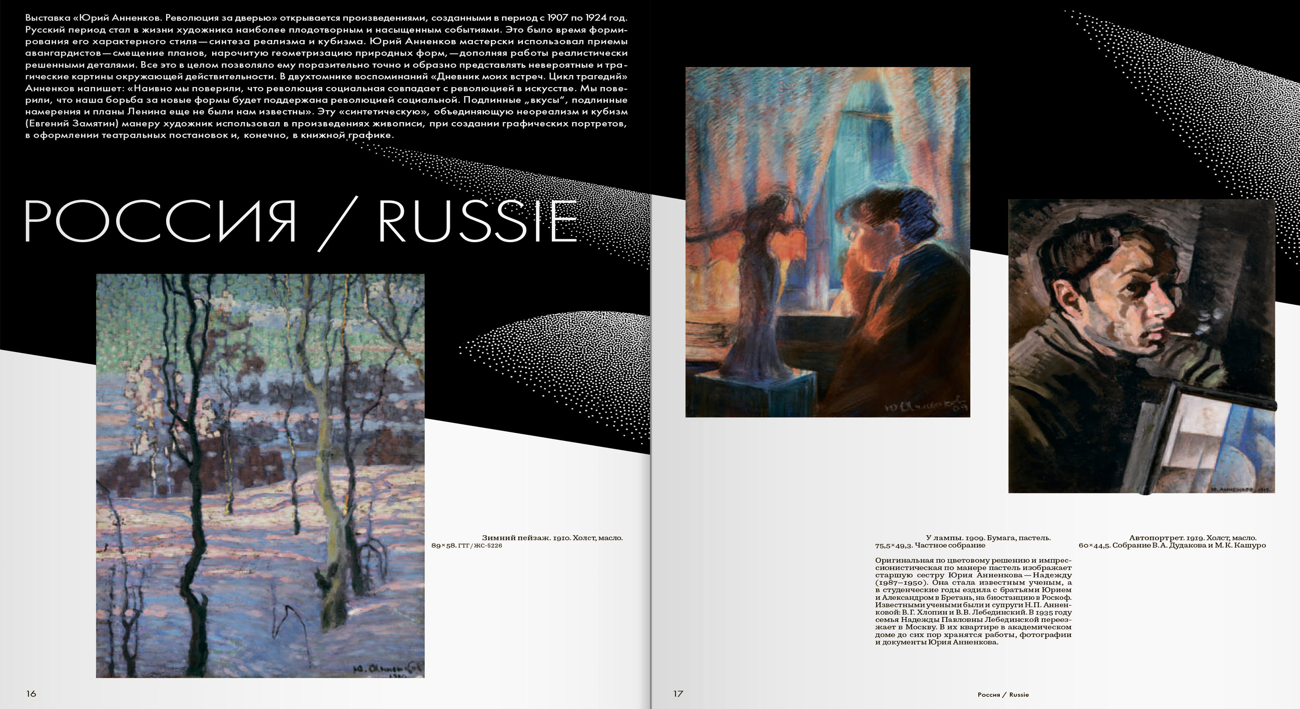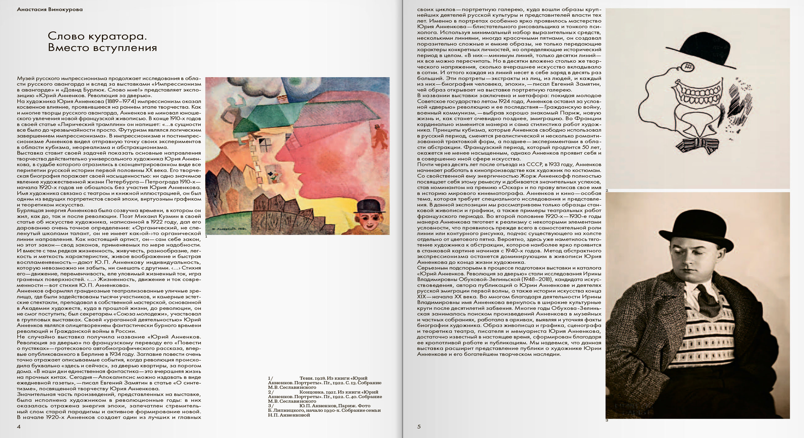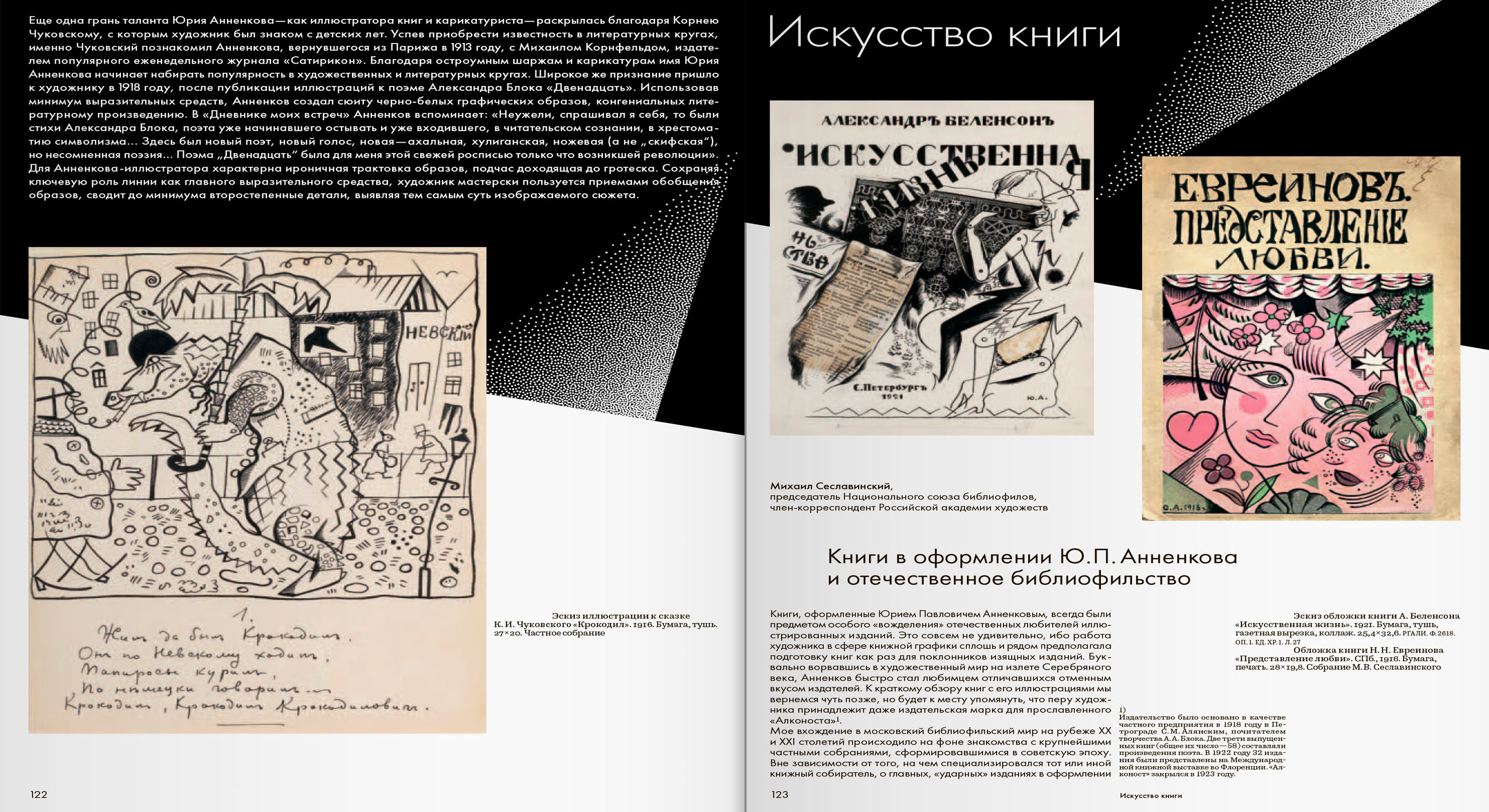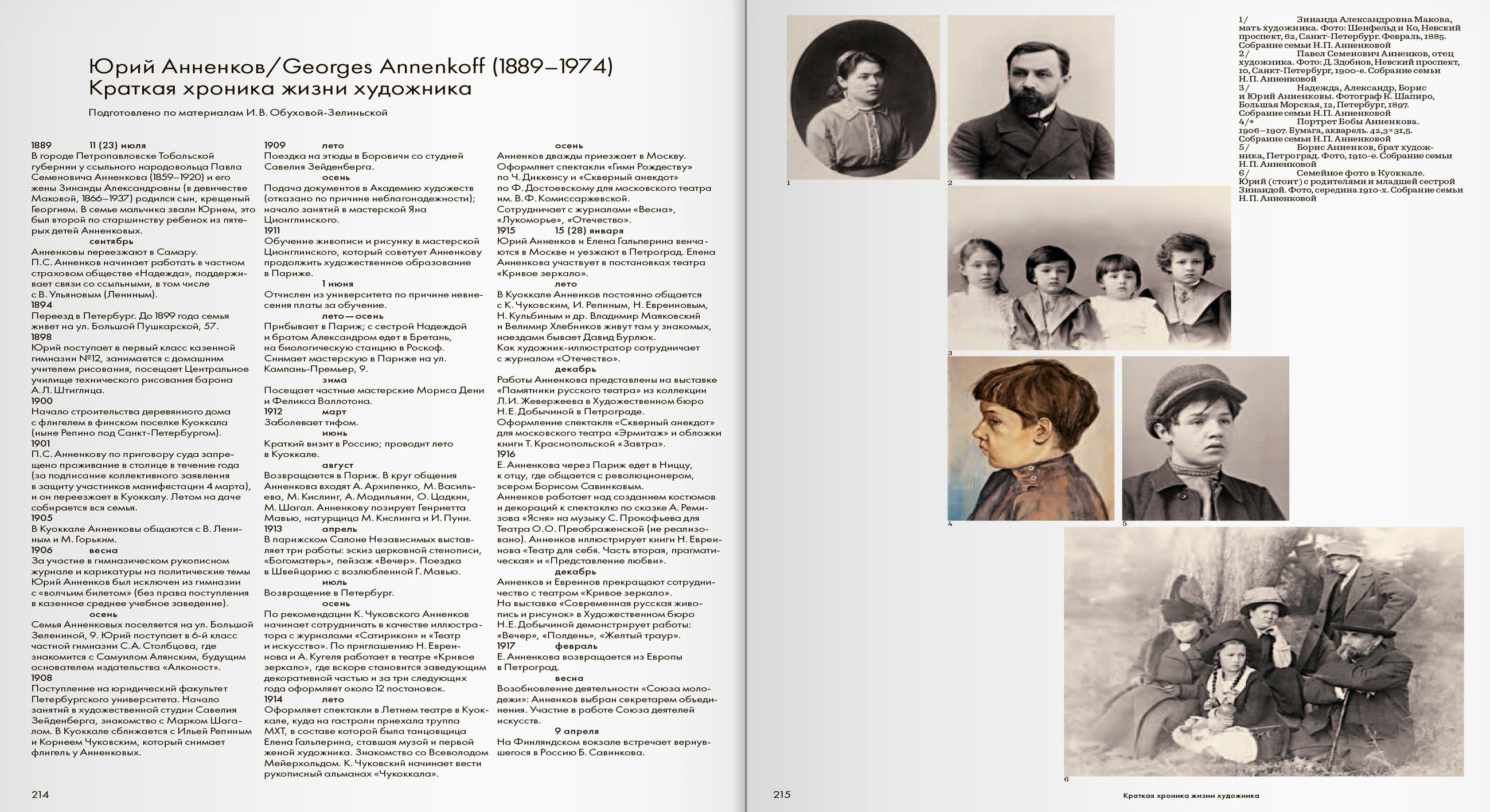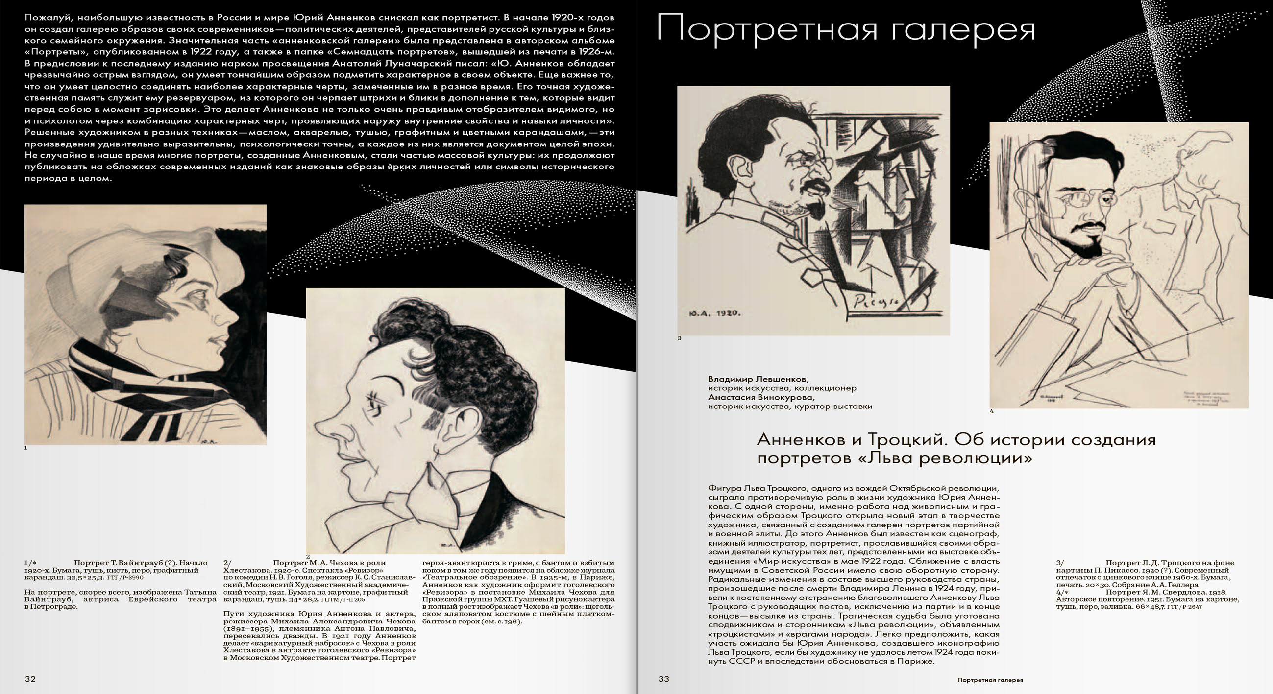 При этом самые известные работы были созданы им в России: особую популярность приобрел цикл портретов современников — деятелей культуры Серебряного века и военно-политической элиты 1920-х годов. Каталог включает статьи специалистов по творчеству Анненкова — Анны Дьяконицы-ной, Елены Струтинской, Михаила Сеславинского, а также биографические комментарии к ключевым фигурам, ставшим моделями художника, среди которых Блок, Горький, Евреинов, Мейерхольд, Чуковский, Троцкий, Луначарский и др.