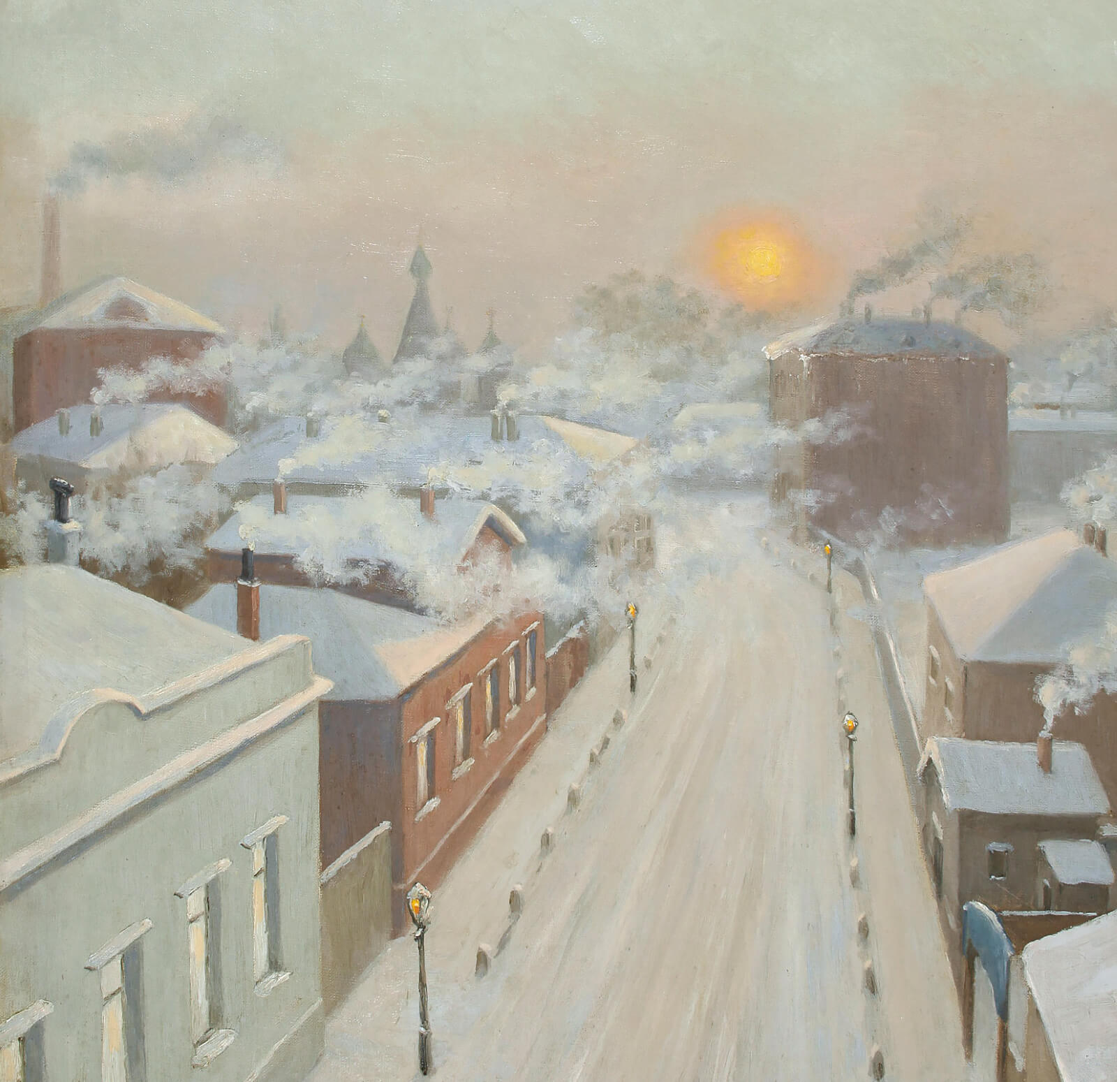 27 декабря — Морозный день акрилом по мотивам картины Михаила Гермашева «Зимний день. Улица в Замоскворечье»