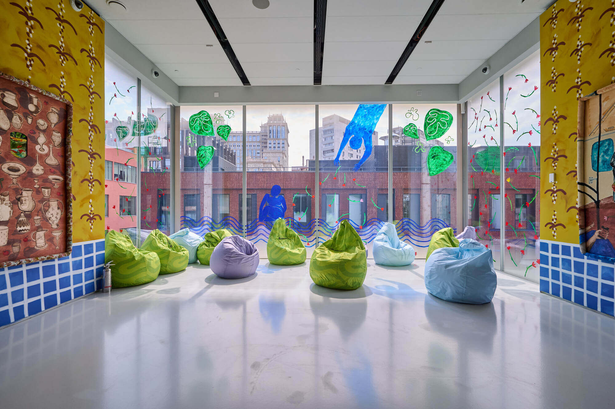 Стены пространства украшают переходящие в витраж росписи и картины-гобелены Кирилла Манчунского. Колористические эксперименты фовистов на большеформатных полотнах продолжает Игорь Скалецкий. А серия холстов Варвары Выборовой приглашает в ателье художницы.