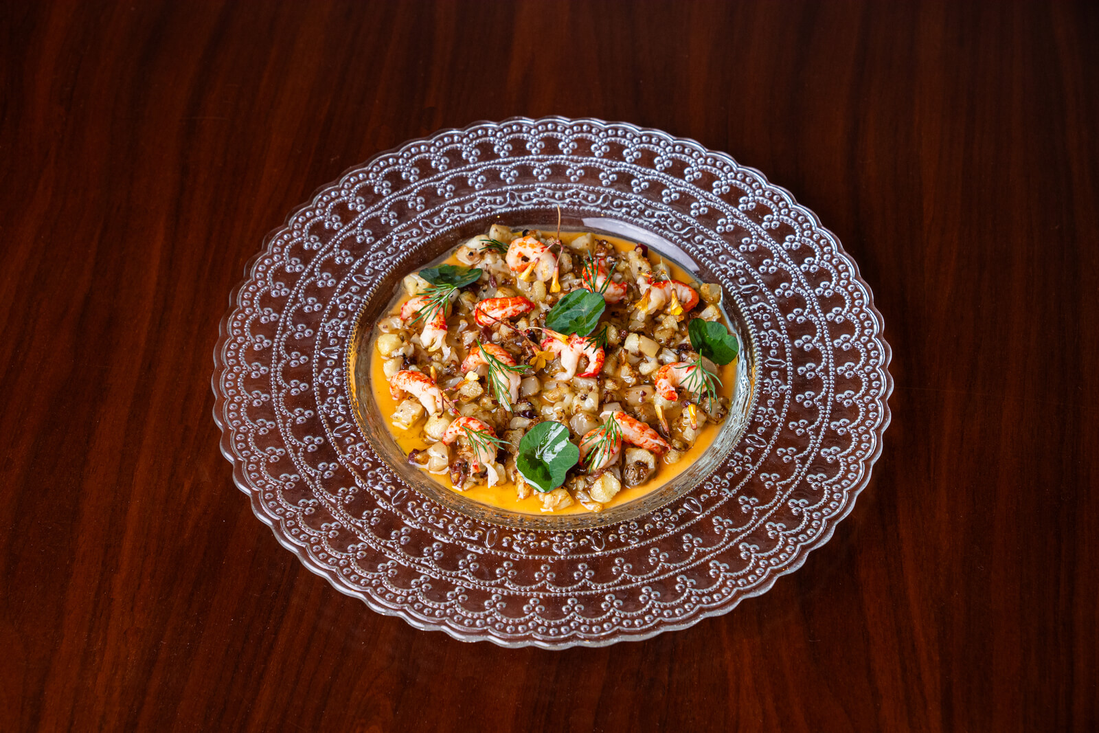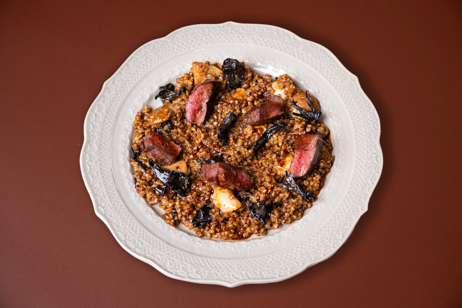 Гречка с олениной, запеченная осетрина, расстегай с печенью налима и красной икрой, двенадцатислойная кулебяка — кажется, что названия этих блюд можно было встретить в трактирных меню и более ста лет назад. Продолжает гастрономический рассказ необычная авторская каша из цветной капусты с раками, омлет под яичным соусом с крабом, сырники из топленого творога и другие позиции.