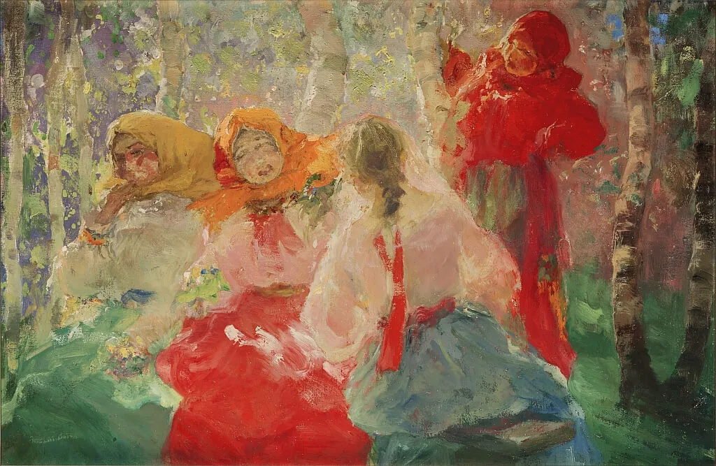 До 28 июля четыре картины из нашего собрания можно увидеть на выставке «Мастер Репин. Эпизоды из жизни учителя и учеников». В музей «Новый Иерусалим» отправились работы Павла Шмарова «Крестьянки в роще», «Две купальщицы», «Автопортрет на зеленом фоне» и картина Николая Богданова-Бельского «Лето».