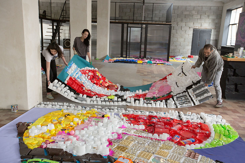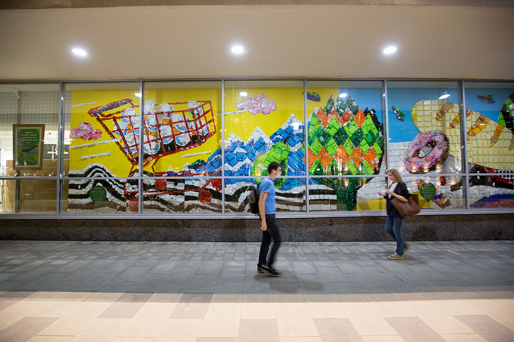 Для создания панно было рассортировано около 4 тонн пластикового очищенного вторсырья, всего использовано более 350 кг материала — упаковка от товаров, лотки для готовой еды, детские игрушки и многое другое. Каждый элемент панно художники вручную выкладывали в рисунок и крепили термоклеем, а фоновые элементы прокрашивали специальной прорезиненной краской. Общая композиция получилась в духе полотен импрессионистов — ее оптимально разглядывать с расстояния, чтобы оценить всю концепцию.