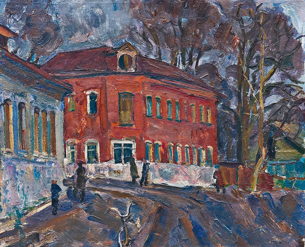 Узнал запечатленный на полотне «Вечерний пейзаж» вид один из посетителей выставки Константин Самохин. Оказалось, что неизвестный художник написал здание на углу улиц Красная Гора и Фрунзе в Звенигороде.